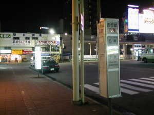 | 八甲田丸を出て、青森ベイブリッジを眺めます。ライトアップがきれいです。 | 駅前のバス乗り場まで歩きます。 |